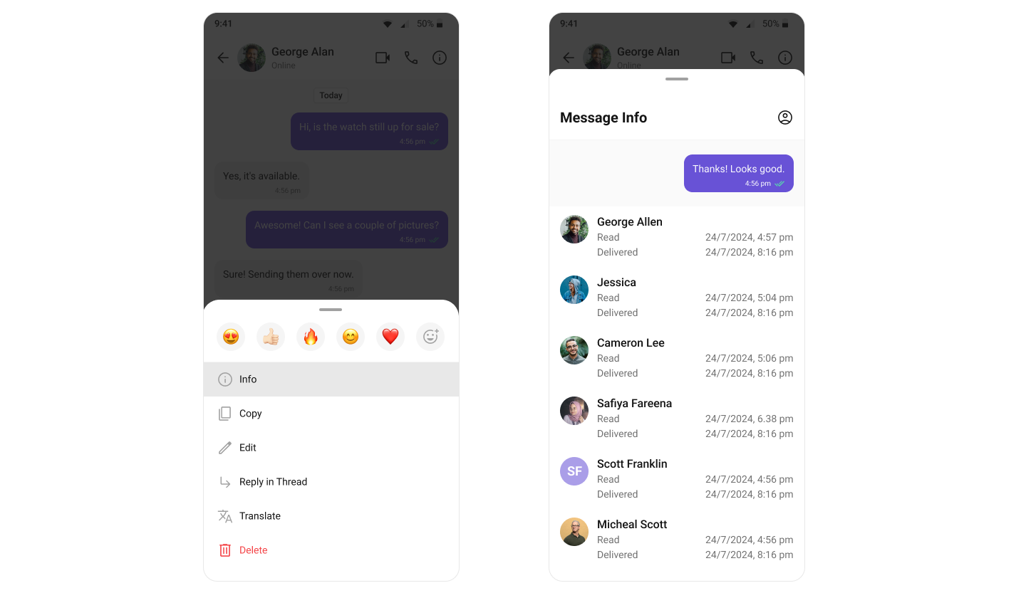 CometChat’s Read Receipts feature provides visibility into the message status, letting users know when a message has been delivered and read. This brings clarity to the communication and ensures users are informed about the status of their messages.