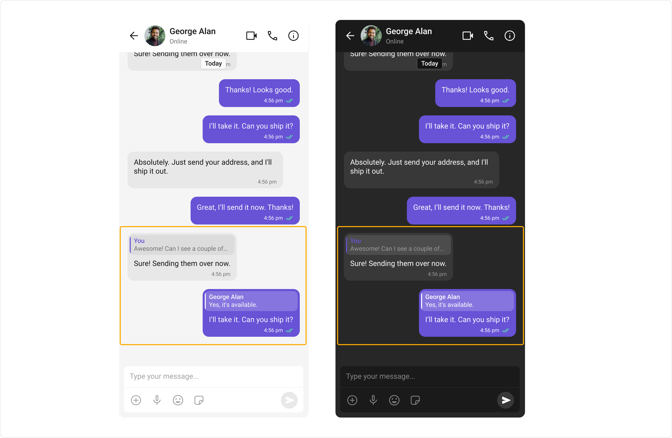 | Message Composer | Message Composer works seamlessly with Quoted Message by showing the quoted reply above the input field, letting users compose their response in proper context. |