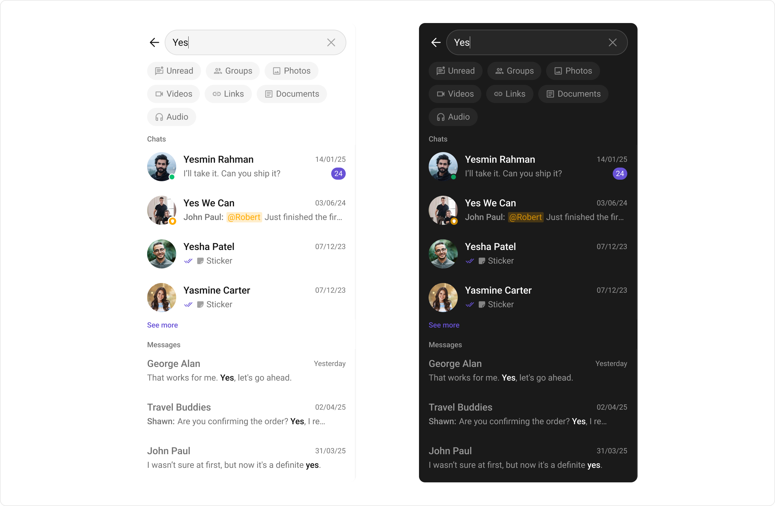 | Search | Search allows users to search across conversations and messages in real time. Users can click on a result to open the conversation or jump directly to a specific message. |
