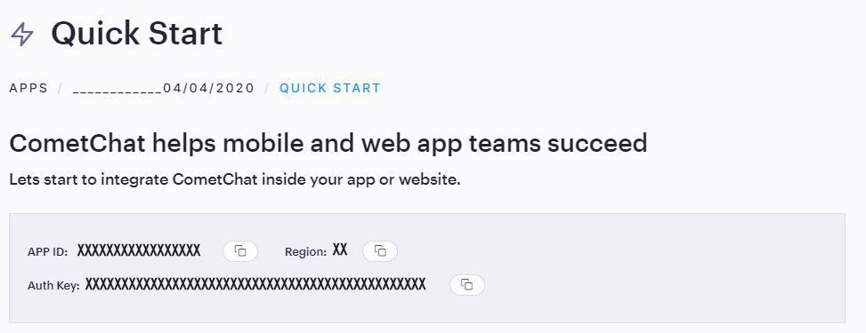 2. You will find APP_ID, AUTH_KEY and REGION key at the top in QuickStart section or else go to “API & Auth Keys” section and copy the APP_ID, API_KEY and REGION key from the “Auth Only API Key” tab.